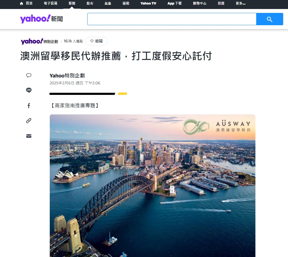 📰Yahoo!奇摩新聞特別企劃 – Ausway澳思維留學移民 品牌故事與介紹 🤗
